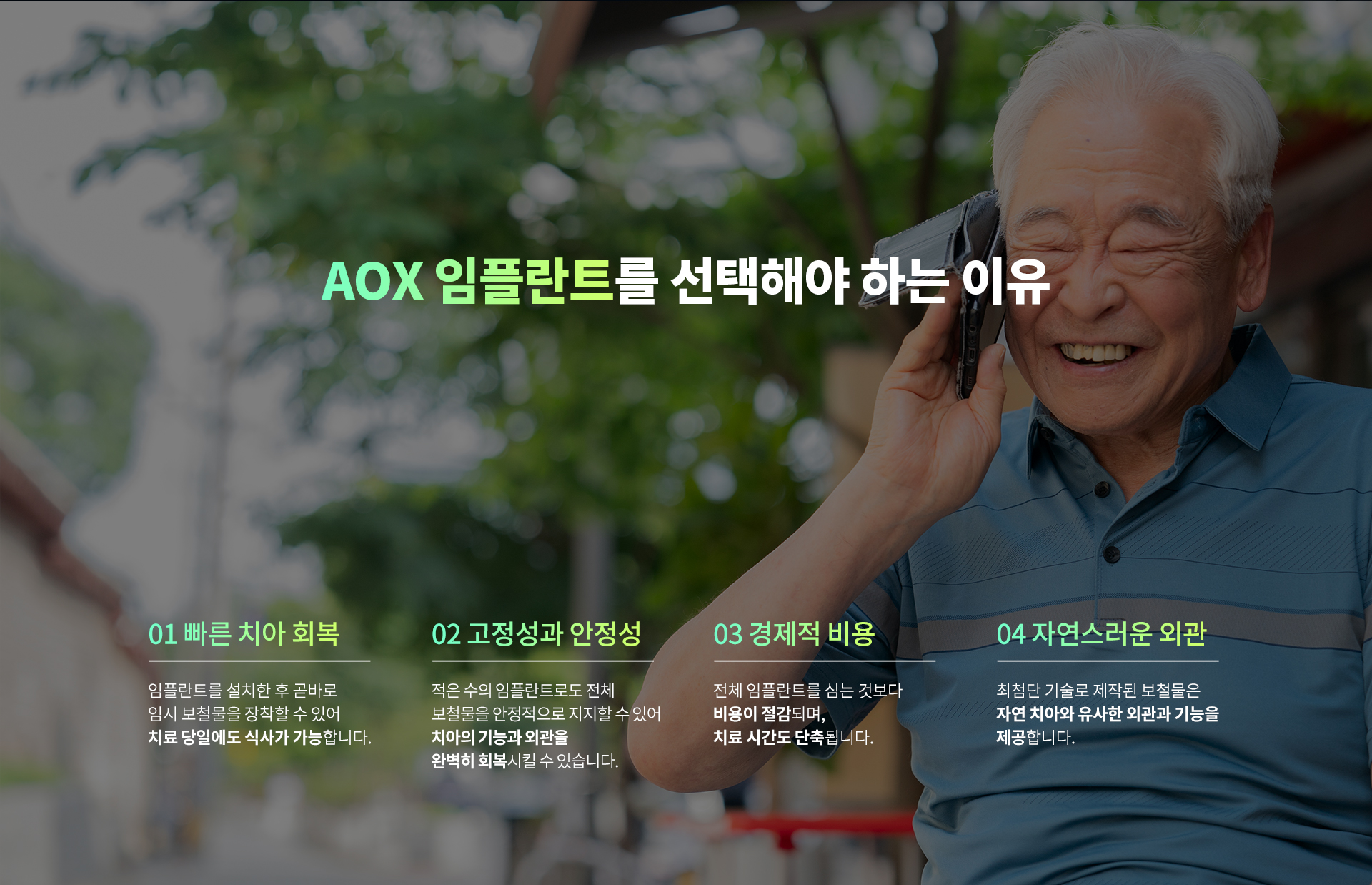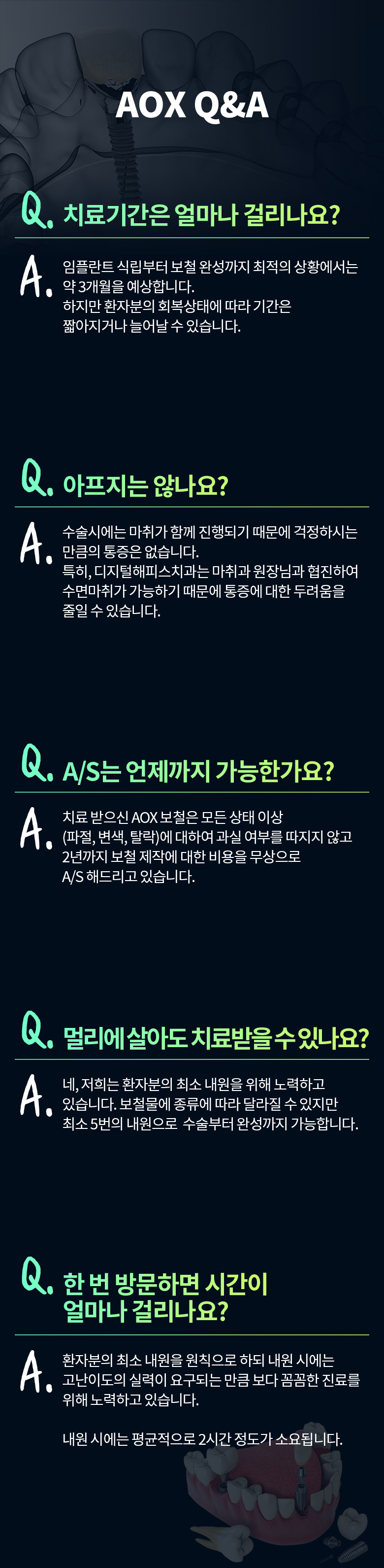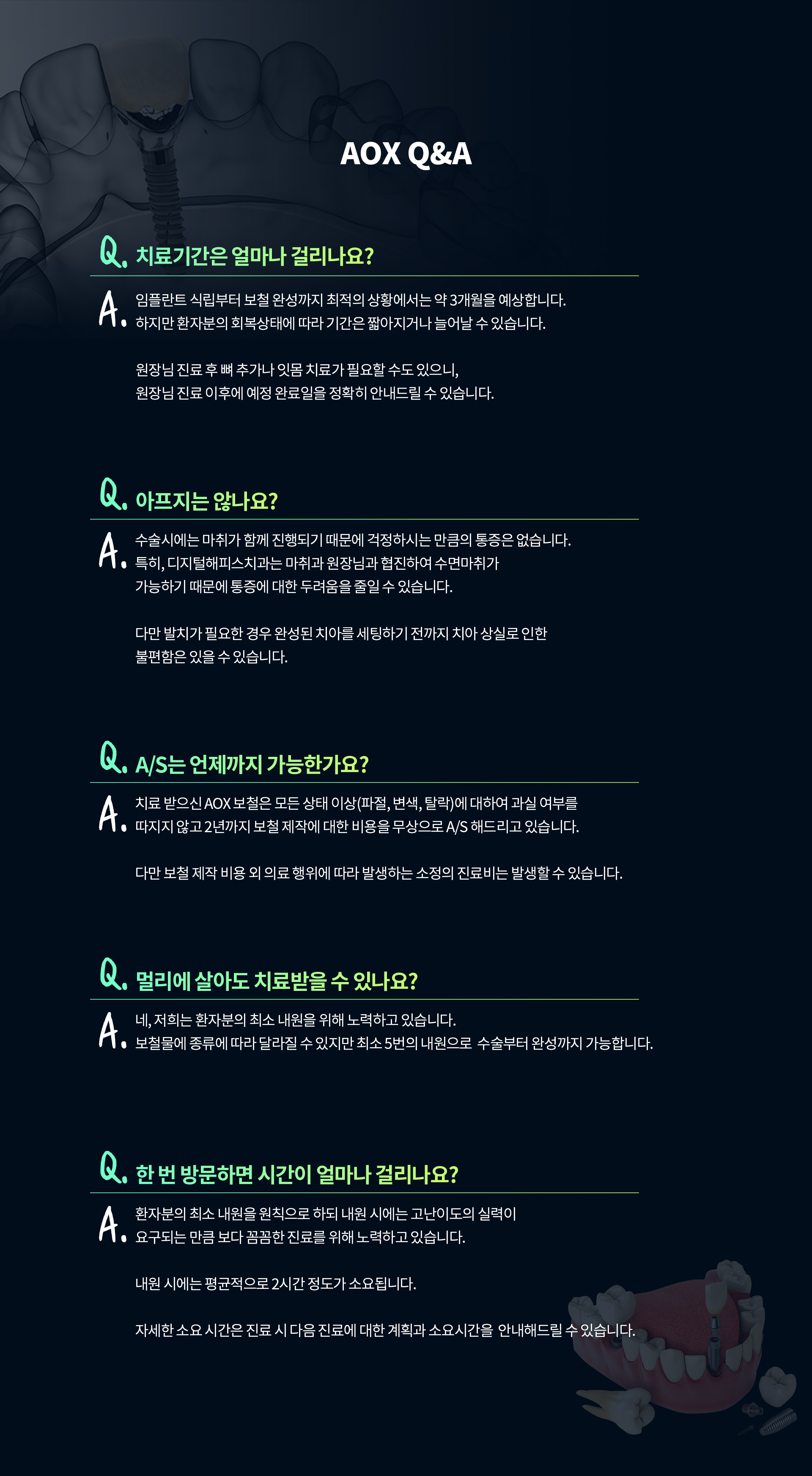 장점 · 가이드 활용으로 출혈, 통증 부담 NO! · 디지털 진단을 기반으로 한 정확한 시술 · 많은 개수를 심지 않아 경제적 · 집도 당일 임시 치아까지 완성하여 빠른 일상복귀! · 단단한 고정력, 강한 저작력