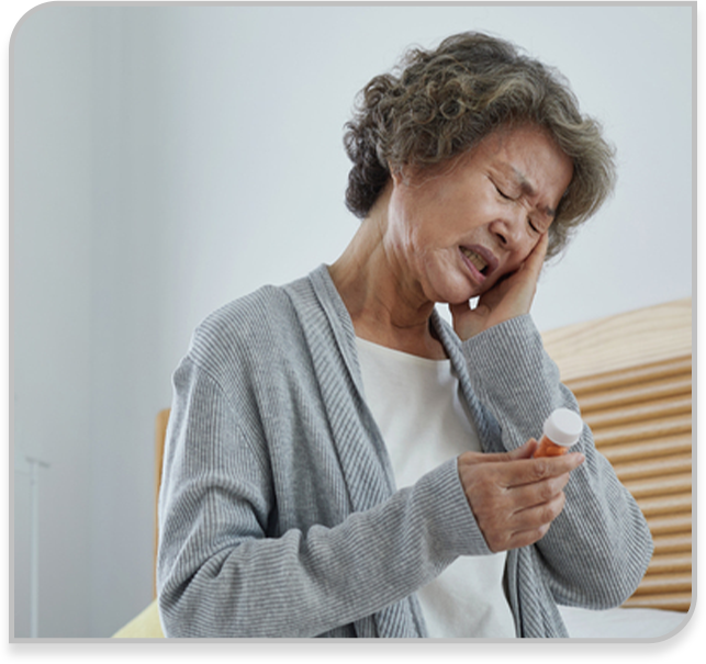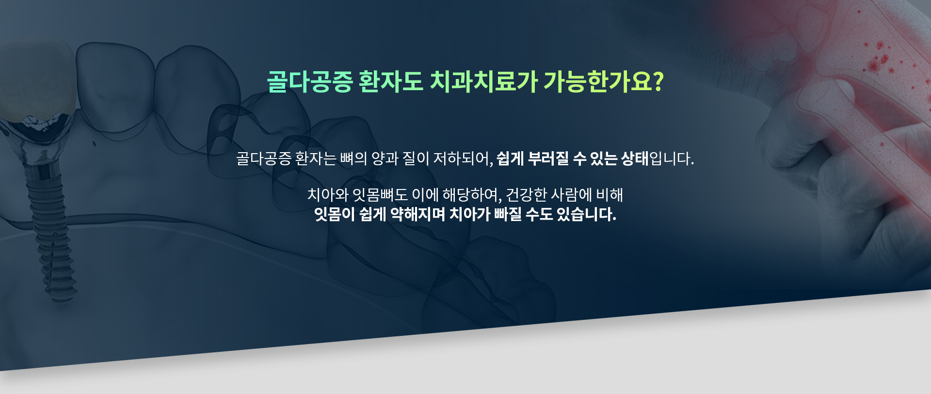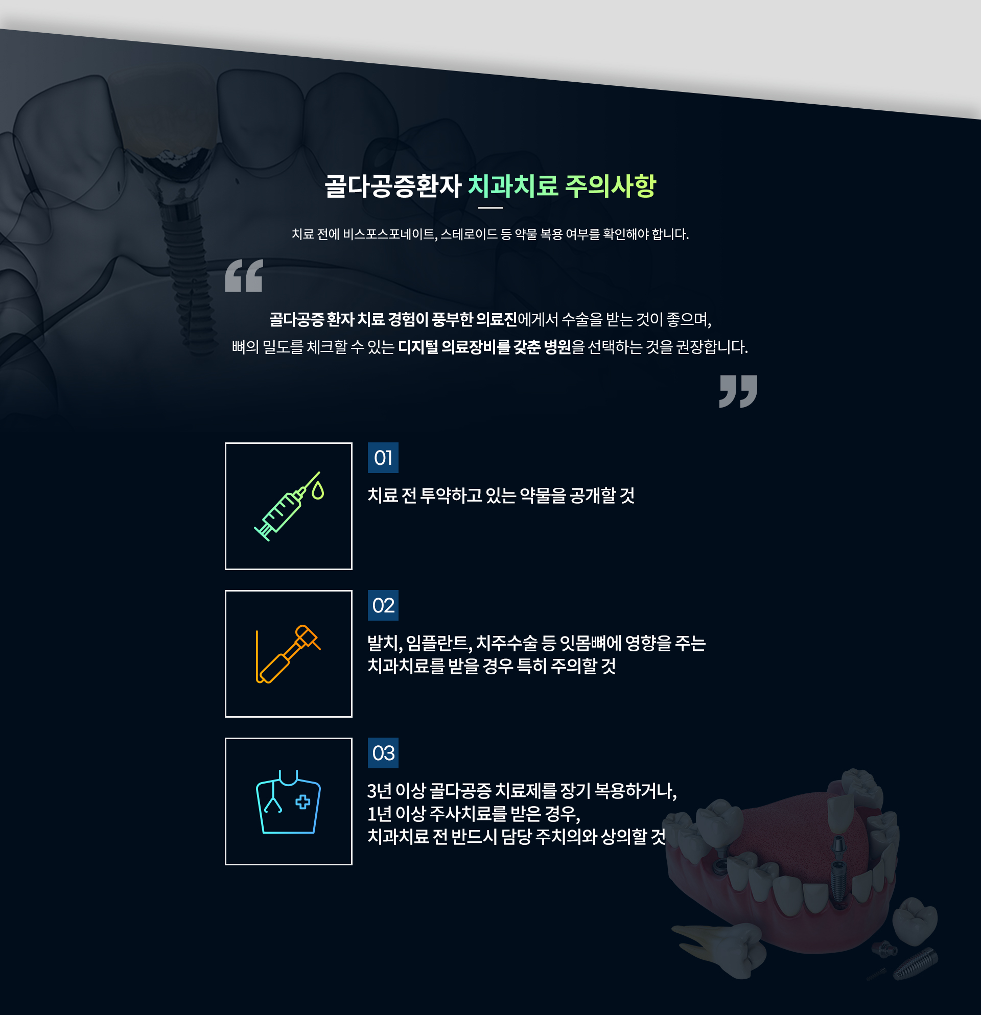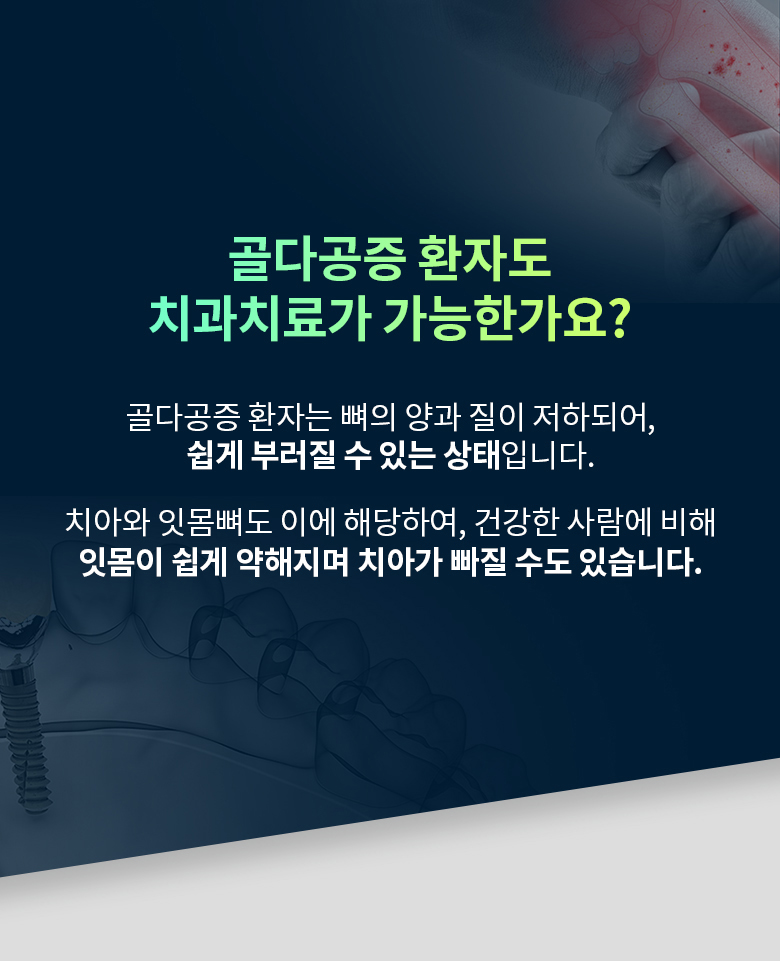 비스포스포네이트 등 일부 골다공증 치료 약물로 인하여, 임플란트 수술 후 부작용이 발생할 수 있습니다. 특히 치아와 잇몸이 약해진 골다공증 환자의 경우, 턱뼈 괴사가 일어날 수 있습니다.